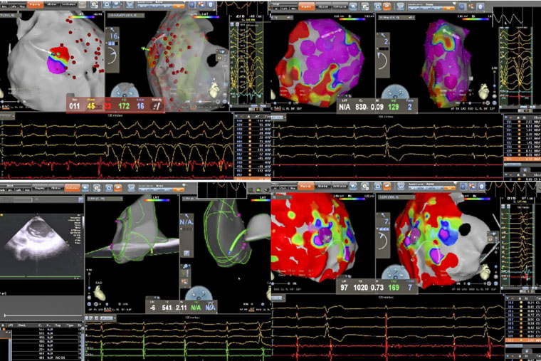 病理性室速通常指由器质性心脏病(如心肌梗死、心肌病等)所导致的室性心动过速。一名患者所患的ARVC,是一种以右心室心肌被纤维脂肪组织替代为特征的遗传性疾病,异常的心肌结构易形成异常电传导通路,从而引发药物难以控制的恶性室速,传统治疗难度大、复发率高。术中,手术团队在X线透视引导下施行心包穿刺,有效规避冠状动脉及心肌损伤风险,为心外膜途径消融建立安全通道。在此基础上,同步进行心内膜及心外膜高密度标测,于右心室多部位识别出低电压区、延迟电位等异常电活动特征,精准判定参与心动过速的关键区域,依托三维电生理标测系统,完成了心内膜与心外膜联合消融。